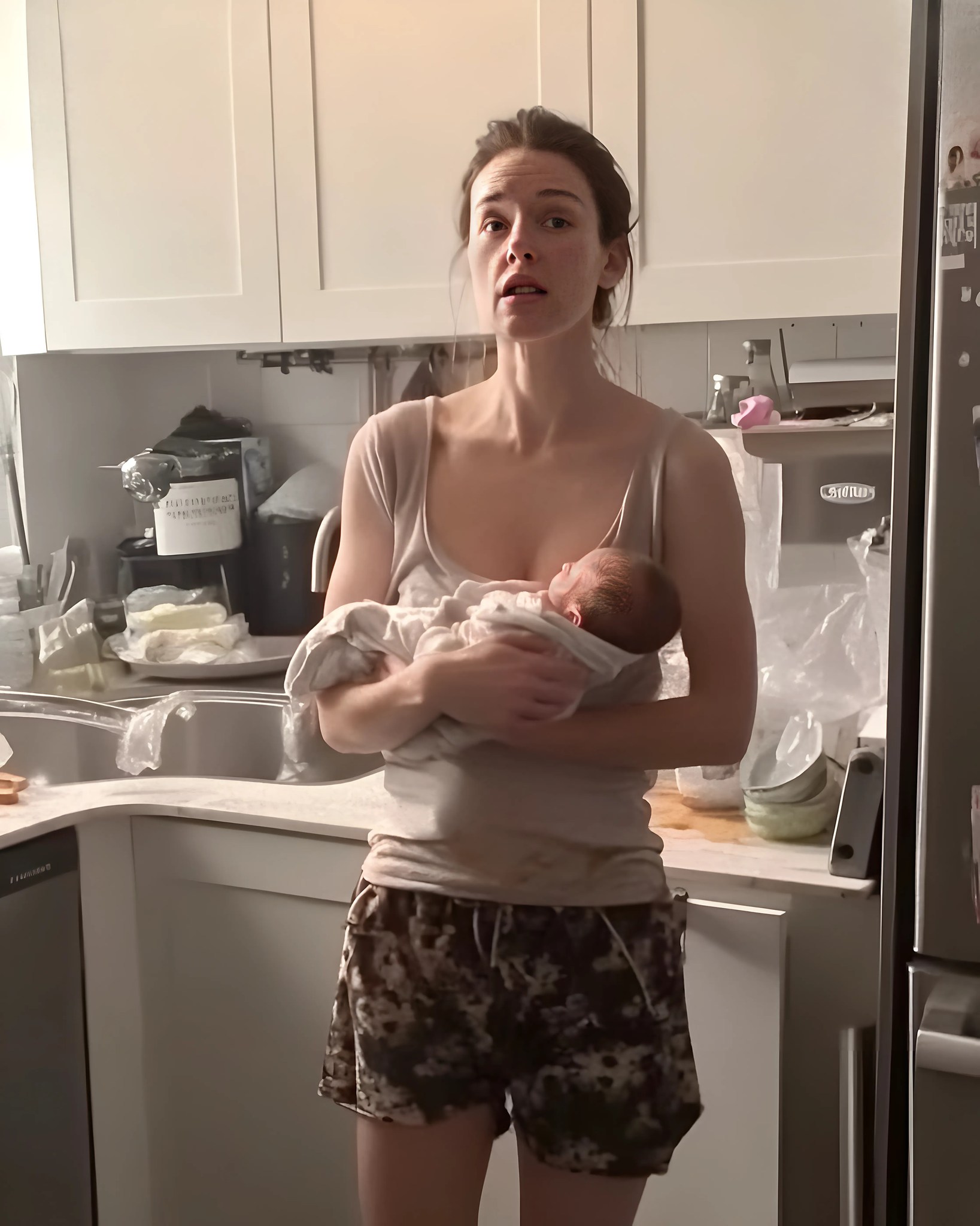Eine junge Frau – höchstens Anfang 20 – stand ein paar Meter entfernt. Sie hielt ein kleines Neugeborenes fest, das in eine blaue Decke gewickelt war.