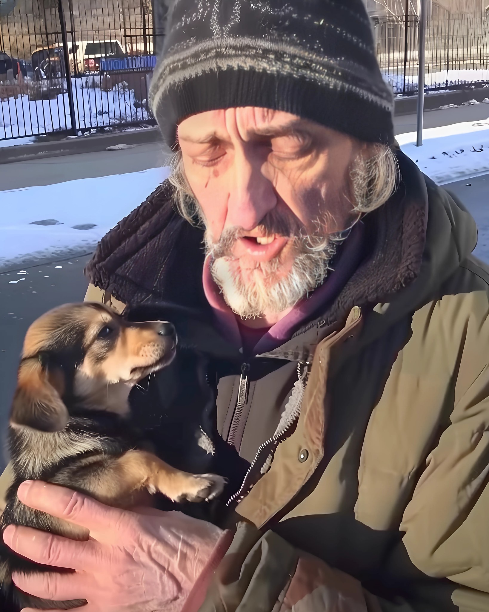Neben ihm stand ein winziger Hund mit buntem Fell und zu großen Ohren. Er sah aus wie ein Wesen, das ein Kind aus alten Spielsachen und Träumen zusammengesetzt hatte.