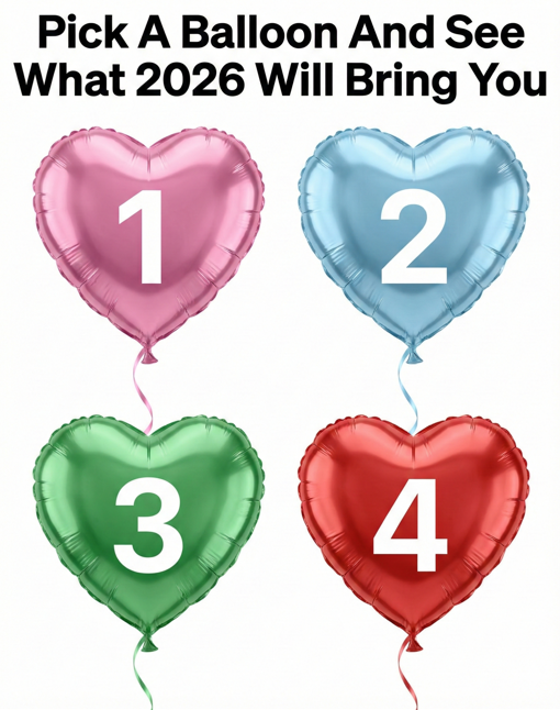 Auf den ersten Blick wirkt das Bild einfach und optimistisch: vier herzförmige Luftballons in vier verschiedenen Farben, die jeweils mit einer Zahl von 1 bis 4 beschriftet sind. Darüber steht in großen Buchstaben: „Wähle einen Luftballon und finde heraus, was 2026 für dich bereithält.“ Es sieht aus wie ein lustiges kleines Spiel – aber der Reiz geht tiefer, als es scheint.